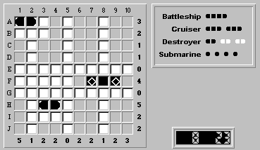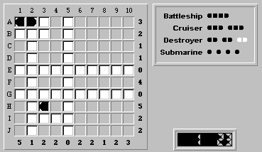 The object of the puzzle is to place all of the ships (displayed in the upper right-hand corner: 1 battleship, 2 cruisers, etc.) on the board so that: