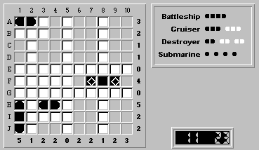 We'll now show that a cruiser cannot be placed in position (H,10)-(J,10). The following figure shows what the board would look like if a cruiser were placed at (H,10)-(J,10):