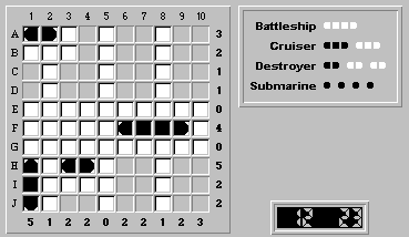 However, because columns 6 and 7 are perfectly symmetrical, the submarine can be placed at either (H,6) or (H,7) without changing the rest of the solution. This would mean that there are two perfectly acceptable, and ambiguous, solutions for this board. Because Fathom It! boards are guaranteed to have a unique solution, a cruiser cannot be placed at (H,10)-(J,10). The remaining cruiser must be at (A,10)-(C,10).