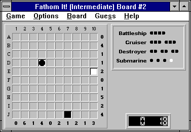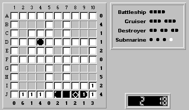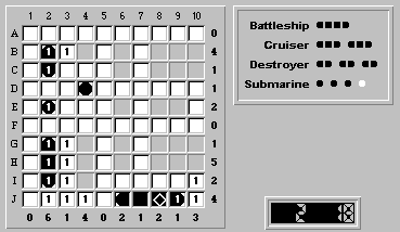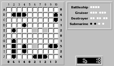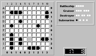 Hmm, no more "obvious" rows or columns to fill with ship segments. So we'll return to the rule of trying to place the largest unplaced ship, in this case our last destroyer.
