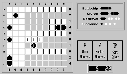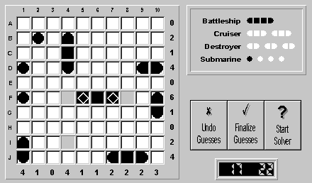 At this point we've basically solved the board. We can add two more overlapping ship segments due to the battleship in row F:
