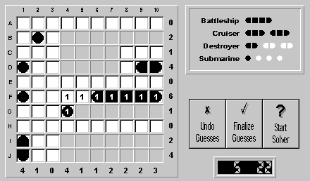 Using the just-formulated rule, we know that the (F,4) - (G,10) rectangle has a vertical destroyer within it. We're going to use this knowledge in a moment. In the meantime let's continue, trying to place the battleship.