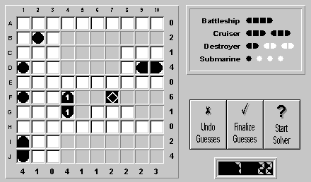 Now we'll make use of the "7x2" rule. We know there must be a vertical destroyer in the (F,3) - (G,10) rectangle. After placing the battleship segment, there are only two positions for this destroyer within the rectangle: column 4 or column 10.