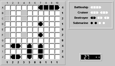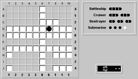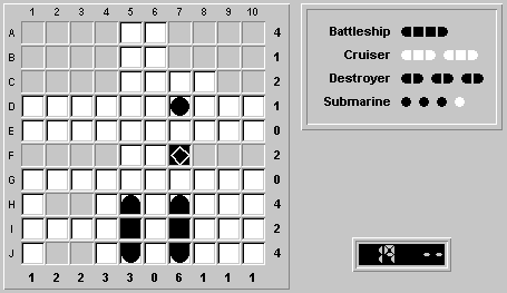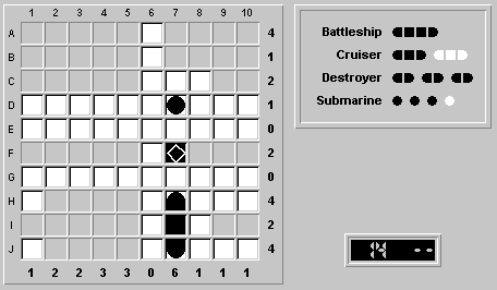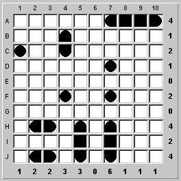 From the occupancy counts, the only remaining places for the second cruiser are rows H and J and columns 4 and 5. We now use the symmetry one more time and deduce that it cannot be along row H or row J, as they would each have to have one. So it's along column 4 or 5... The rest is left as an exercise for the reader. [Editor: We will continue the solution in the following frames.] |