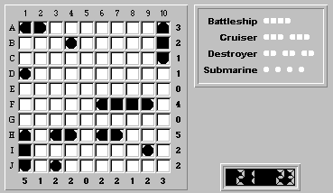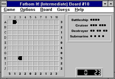 However, because columns 6 and 7 are perfectly symmetrical, the submarine can be placed at either (H,6) or (H,7) without changing the rest of the solution. This would mean that there are two perfectly acceptable, and ambiguous, solutions for this board. Because Fathom It! boards are guaranteed to have a unique solution, a cruiser cannot be placed at (H,10)-(J,10). The remaining cruiser must be at (A,10)-(C,10).