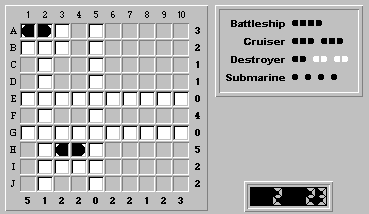 The object of the puzzle is to place all of the ships (displayed in the upper right-hand corner: 1 battleship, 2 cruisers, etc.) on the board so that: