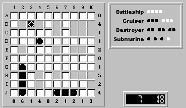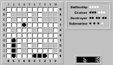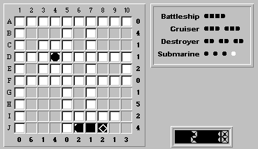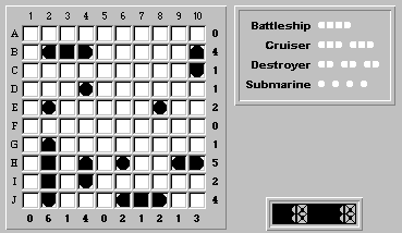 Hmm, no more "obvious" rows or columns to fill with ship segments. So we'll return to the rule of trying to place the largest unplaced ship, in this case our last destroyer.