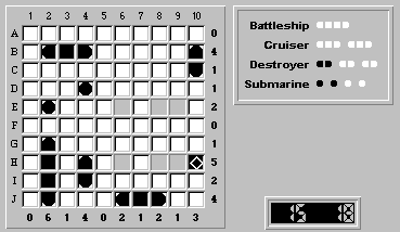 A glance shows us that the only position to place the destroyer is (H,9) to (H,10). Convince yourself this is true.
