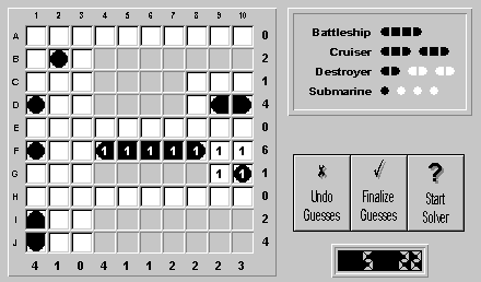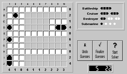 Using the just-formulated rule, we know that the (F,4) - (G,10) rectangle has a vertical destroyer within it. We're going to use this knowledge in a moment. In the meantime let's continue, trying to place the battleship.