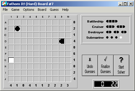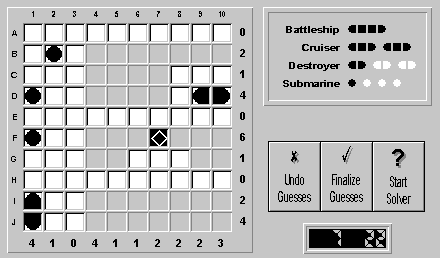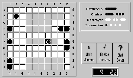 Now we'll make use of the "7x2" rule. We know there must be a vertical destroyer in the (F,3) - (G,10) rectangle. After placing the battleship segment, there are only two positions for this destroyer within the rectangle: column 4 or column 10.