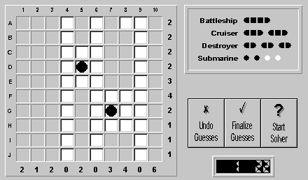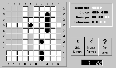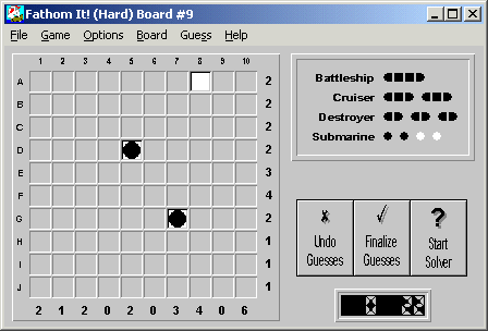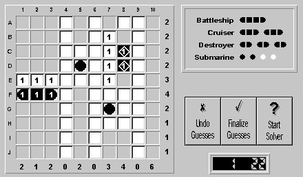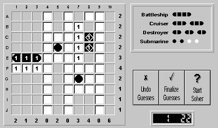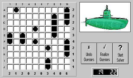 The first step (although Fathom It! purists/masochists will disagree <g>) is to fill in all obvious water squares. [Ed. Using Fathom It! you do this by left-clicking an obvious water square to show water, then right-clicking it to "finalize" the square. All squares around a submarine are water, so we'll finalize square (C,4) as water.] Doing this we get: