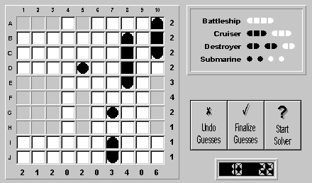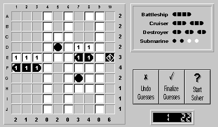 But now, lo and behold, there are no positions to place the remaining cruiser. Placing a cruiser in (E,1) - (E,3) would "close off" row F, leaving too few empty squares to place the required four (4) segments.: