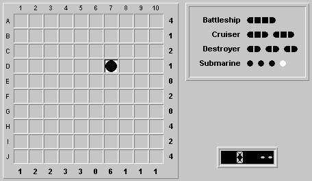 From the occupancy counts, the only remaining places for the second cruiser are rows H and J and columns 4 and 5. We now use the symmetry one more time and deduce that it cannot be along row H or row J, as they would each have to have one. So it's along column 4 or 5... The rest is left as an exercise for the reader. [Editor: We will continue the solution in the following frames.] |