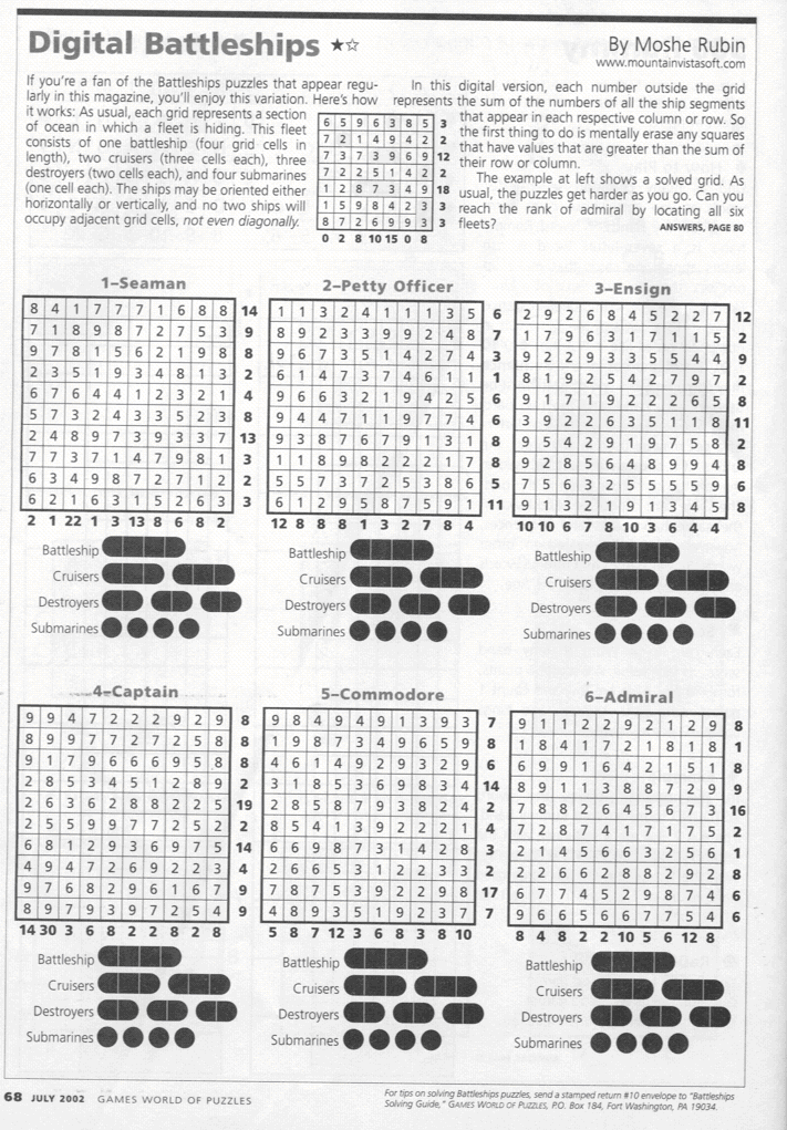 The values on the right and bottom edges of the grid reveal the sum of the numbers in each of the ship segments that appear in each respective row or column.